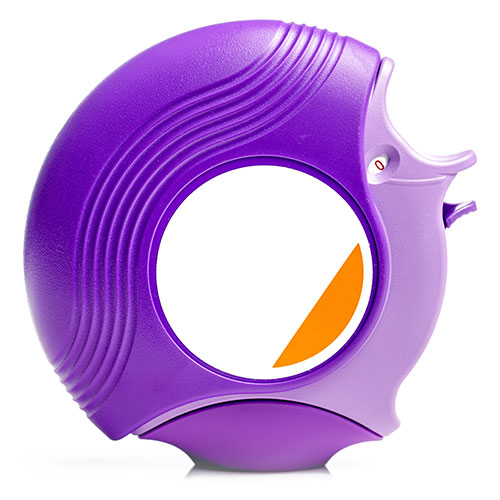 Abrir la carcasa externa del inhalador, desplazando la carcasa hacia la derecha hasta oír un “clic”, dejando así al descubierto la boquilla y la palanca.