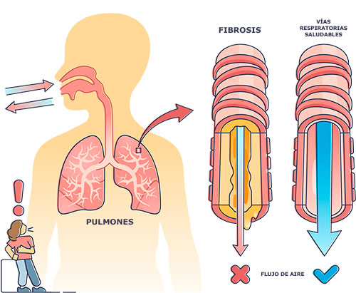 La fibrosis pulmonar surge de la reparación anómala de un daño pulmonar que tiene como consecuencia la acumulación de proteínas, fibroblastos … en la matriz extracelular. Esto provoca una cicatrización crónica e irreversible que conlleva el engrosamiento de la superficie de intercambio gaseoso y con ello la rigidez de los pulmones.