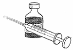 - Prepare la medicación aplicando spray desinfectante en el tapón de goma del vial. Si la presentación es en polvo será necesario diluirlo con suero salino y/o agua destilada y serán necesarias dos agujas más.